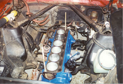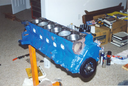 Since "inheriting" this car in 1996, I was on the third head due to cracks in one of the exhaust manifold mounting points that could not be welded (not from lack of trying!). In fall 2000, the bottom half of the engine finally gave up the ghost, going down to about 90 psi in the number-6 cylinder. So over the next 12 months, I found and had a 1965 block rebuilt. Of course I couldn't leave well enough alone, so I went with several hop-ups from Clifford Performance, including a hotter cam and an exhaust manifold.