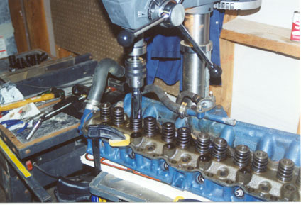 With the hotter cam came the requirement to install stronger valve springs. A tech at NAPA suggested using a large socket in a drill press as a spring compressor. This worked very well (other than the head's tendency to want to fall off the drill press with the end springs).