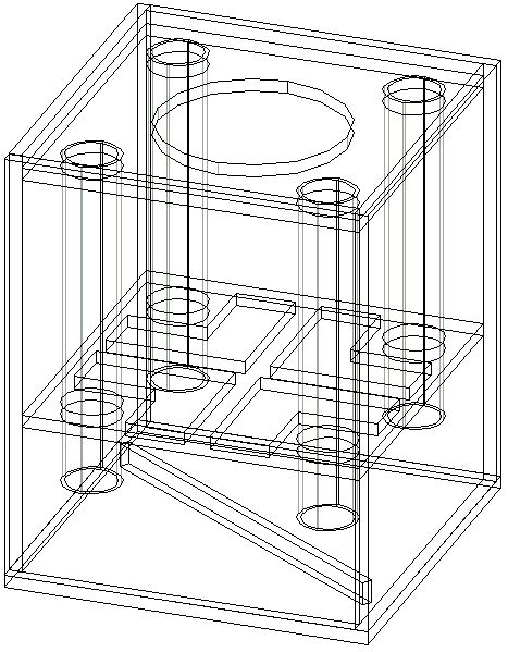 Wire-frame layout. Box is upside down (drive goes in the large hole in the top of the picture). The vent are is divided into 4 tubes around the perimeter of the driver. An internal brace is place at the Golden Ratio between the top and bottom of the box.