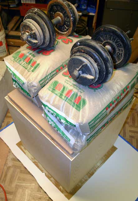 Laminating the 1/4" birch-faced plywood to the MDF. This was done primarily to build up thickness of the box, as well as to cover the screw holes in preparation for the mahogany veneer. The caul is a piece of 3/4" particle board with melamine facing. There is about 400# of dead weight (4x50# sand, 2x55# dumbbells, 5-gal bucket of paint, 1 lead brick, and caul) pressing the plywood down.