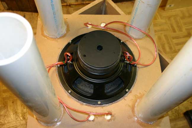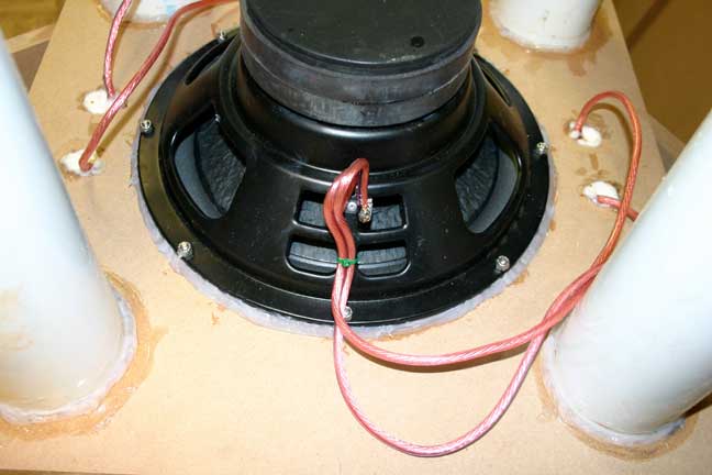Mounting of driver. Drive was mounted from the rear, and was caulked and through-bolted using stainless hardware and nylock nuts. Cable is Monster Cable knock-off from Parts Express. Connections are all soldered.