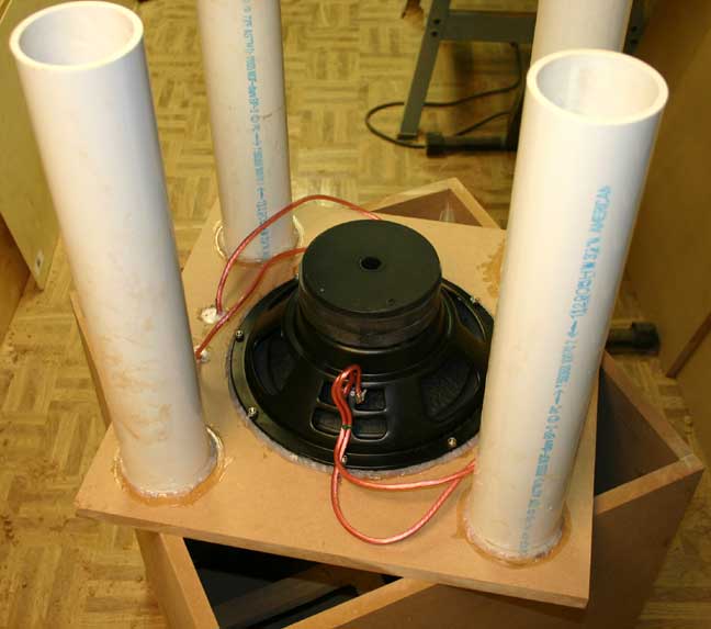 I used 3" ID PVC pipe from Home Depot for the port material. The edges are radiused, though you can't see this in the pictures. The ports are set into the driver plate, and through the internal brace. There is about 5" between the ends of the ports and the top of the box. The clamps are holding the speaker terminals (it's a dual-voice coil driver, so there are two sets of terminals). Holes for terminals are filled with acrylic latex caulk.