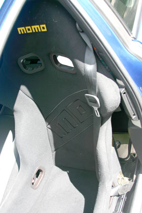 Weight: the Momo Start 2007 weighs 20.0#, and the MemoryFab bracket weighs 9.5#. The factory seat with the seat rail bracket is 39.0#. So I have added (in the Lotus sense) about 10# of lightness to the car.